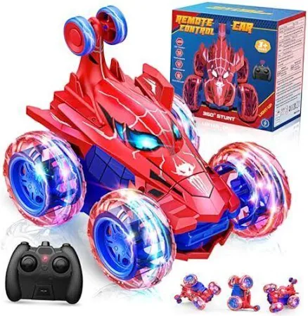 - 360° Spin RC car: The remote controlled car has a 360° rotating front axle and large wheels, which allow amazing 360° rotations with ease. The popular spider shape, combined with cool LED lights, is very popular with children aged 3 and over.